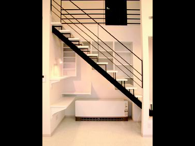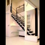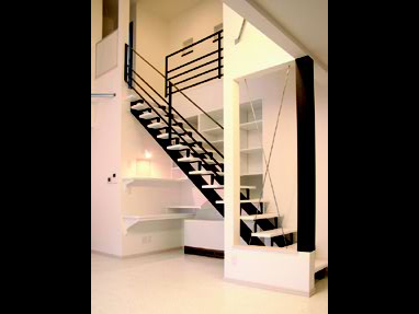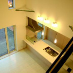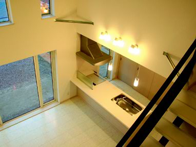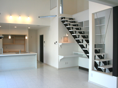白と黒で統一された空間を開放的な吹き抜けが幸せ色に。