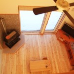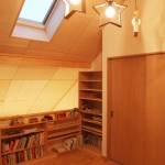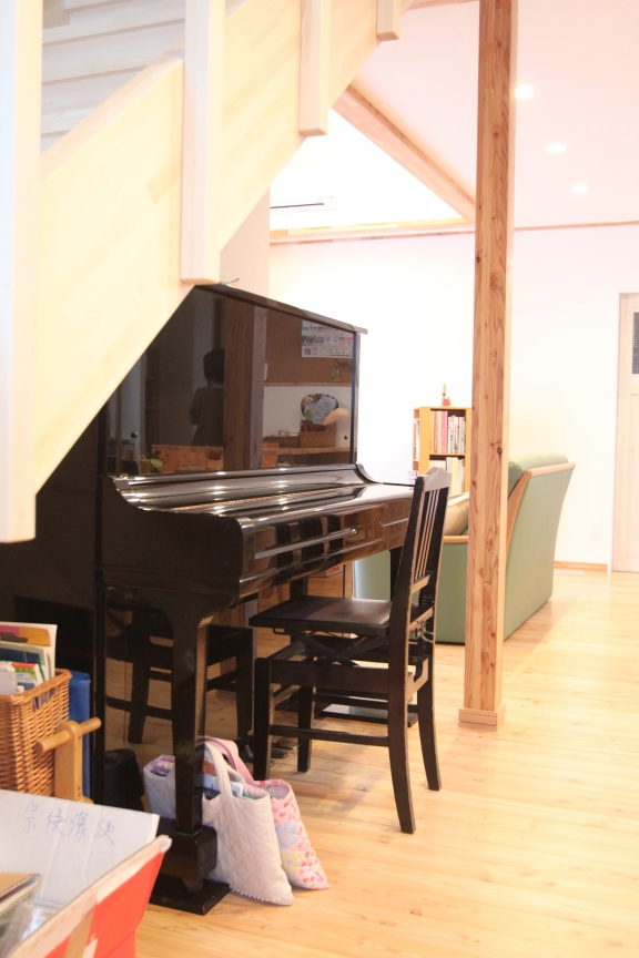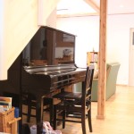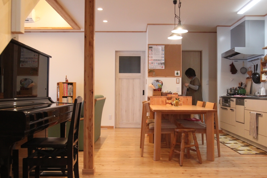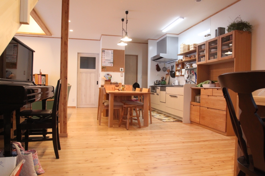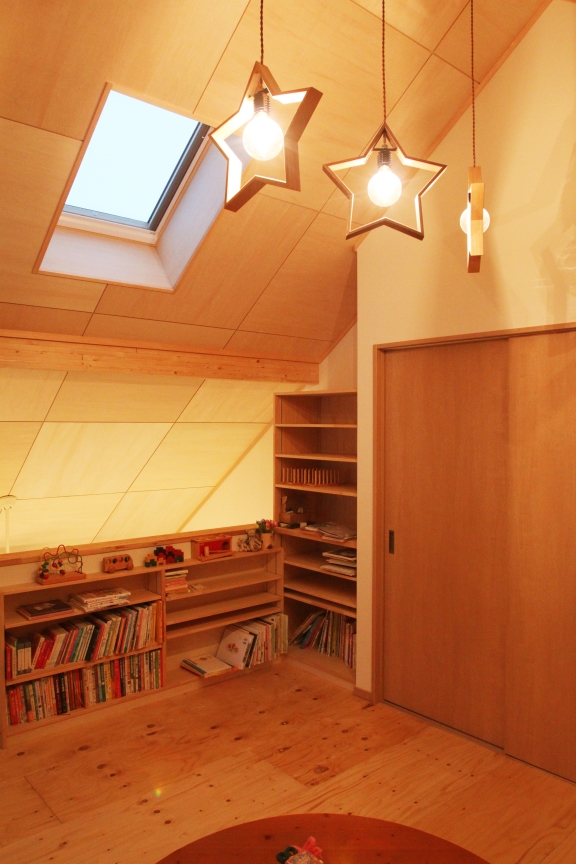 2階のフリースペースには施主様支給の照明と床にはトド松の合版を採用。